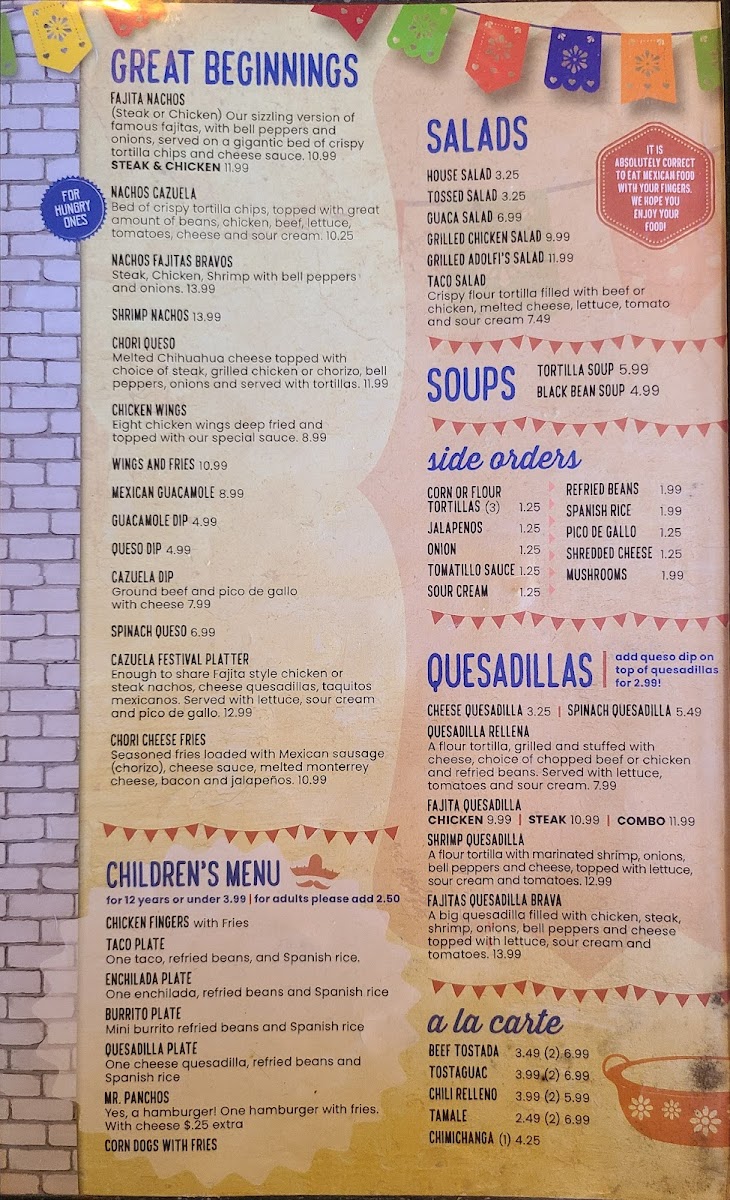 Welcome to La Cazuela, a vibrant Mexican restaurant nestled at 1401 E Fortification St, Jackson, MS. Known for its flavorful offerings, La Cazuela features an array of soups including the delightful Shrimp Soup and the traditional Azteca Tortilla Soup, sure to satisfy any craving.